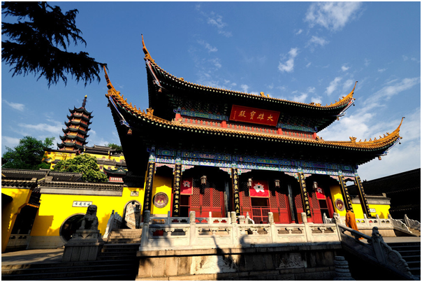 走出天王殿,迎面这座重檐歇山顶大殿,就是“大雄宝殿”,它由中国佛教协会会长赵朴初题写殿名。“大雄”是对释迦牟尼的尊称,它的意思是大智大勇,能镇伏邪魔。大雄宝殿历经磨难,七毁八建,现在我们看到的大雄宝殿于1989年10月建成,总面积800平方米,是金山寺历史上最高最大的大雄宝殿。黄墙红柱,金色的琉璃屋面,白石柱础栏杆,大殿为正方形,高25米,深24.6米,内36根子柱擎立。由于大殿在原址向后移八米,殿前更为开阔。大殿设计兼有北方宫廷雄浑富丽气势与南方园林精美雅致的风格。