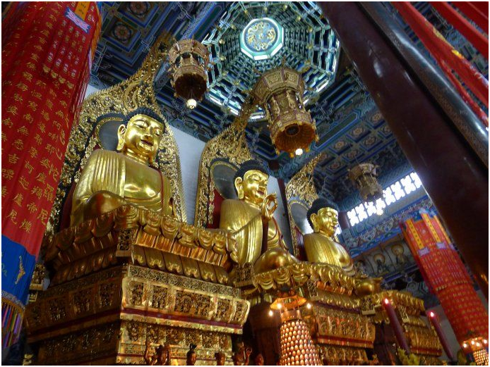 殿前有七级台阶,佛称是走上七级佛陀达到最高境界。进入大殿,正中三尊金身佛像并列而坐,佛像身高4.8米,端坐在莲花座上,慈眉善目,仪态安详。中间供奉的是释迦牟尼佛,右手食指上指,大拇指下指,告知人们天地全在她的掌控之中,祭拜一下,保天保地。他的左侧是药师佛,右侧是阿弥陀佛。这三座佛民间称为“横三世佛”。释迦牟尼是佛教始祖,是娑婆世界的教主,药师佛是东方净琉璃世界的教主,阿弥陀佛是西方极乐世界教主。