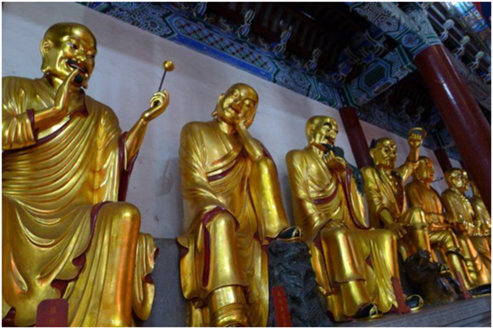 大殿两旁站立十八罗汉,形象高大,栩栩如生。