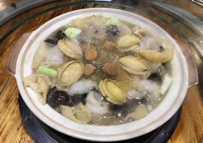 吃饱一直等到天都变紫了最后一个小伙伴奶总才来,就出发去美未居·顺德菜吃晚饭,最好提前订位,到了会退订金,本来计划是去吃水蛇粥的不过现在没了,大家票选了这家,我来到后发现这家名字是美味居,味的口字旁是一条蛇的造型,估计以前也是吃蛇的,现在转型做佛跳墙了。这里的佛跳墙有两种,第一种是要自己刷的火锅,我们懒得弄点了一锅熟的第二种,还点了花椒蒸笋壳鱼和腐乳炒通菜。