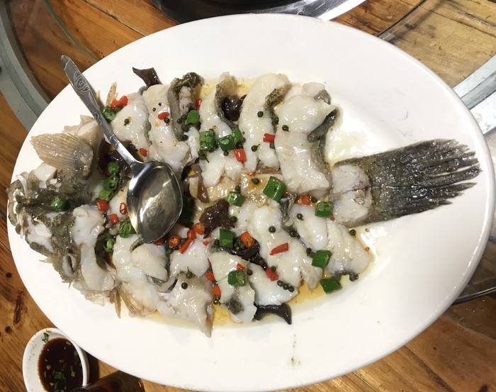 花椒蒸笋壳鱼:原本想点桂花鱼的,可是我们去的太晚都没有了,就换了笋壳鱼,我看点评笋壳鱼一般是做油泡的,不过花椒蒸挺好吃的,比佛跳墙好吃,花椒的香味和店家的调味很好地调出鱼的鲜味,鱼肉也很滑很嫩,推荐!(不过住在珠海的大神觉得其实这种就是普通水平,自己家也能做得出的水平)