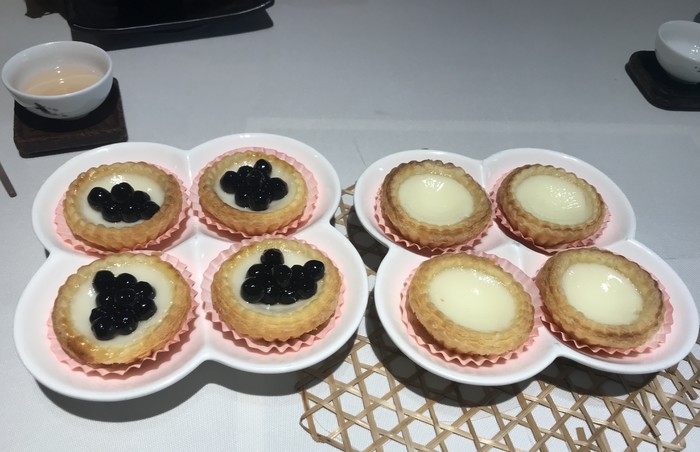 我们点了双皮奶蛋挞、珍珠双皮奶蛋挞、味可道虾饺皇、虫草花烧麦皇、金牌红豆博撑、招牌脆皮松糕、鬼五马六春卷、穗香头菜炒莺嘴。