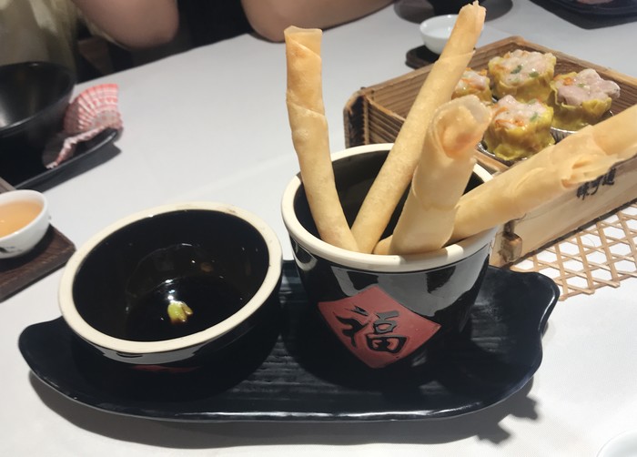鬼五马六春卷:推荐!别看只有窄窄的一条,里面满满都是虾肉和猪肉内馅,酱汁是酱油和芥的末搭配,吃起来真的比一般的春卷更美味。