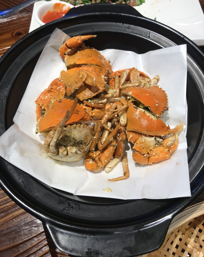 我们刚12点左右已经开始没位置了,和其他人拼座一间大房,走的时候楼下满满都是等位的。点菜不在房里,房里也没有菜单,要到一楼水池点餐,估计想引导你点海鲜,其他海鲜有多贵我不知道,不过我们点的盐焗蟹是按只算的,80块钱就一小小只,5个人最少点3只,非常不划算,顺德其实不算过分内陆,海鲜不应该至于这么贵吧。我们点了招牌盐焗蟹、串烧猪颈肉、炸牛奶拼炸云吞、蚬肉生菜包。