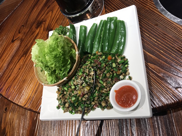 蚬肉生菜包:这个更加不用点,内陷和青椒生菜的比例完全不对,一堆内陷只有几只青椒和几片生菜??而且也不好吃,看图片就能完全想象的味道。就是韭菜炒蚬肉然后夹去籽青椒夹生菜+蒜蓉酱,有点类似韩国烤肉的吃法,不过吃到嘴里的味道各自分离,完全没有要融合一起的意思。