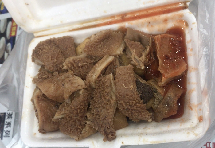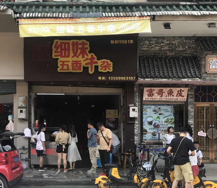 细妹牛杂点了小份牛杂:只有大份和小份之分,小的也要30块钱,我觉得除了萝卜以外其他都不好吃,非常咸,还不没有在小学路边随便买的好吃,不推荐!细妹对面有家叫大润,像是吃炸品的,奶总之前五一来的时候说很多人排队,我用了3秒的时间观察了一下店里的食客,看起来没有吃出幸福感,就匆匆走了,如果有吃过的可以留言给其他人参考参考。