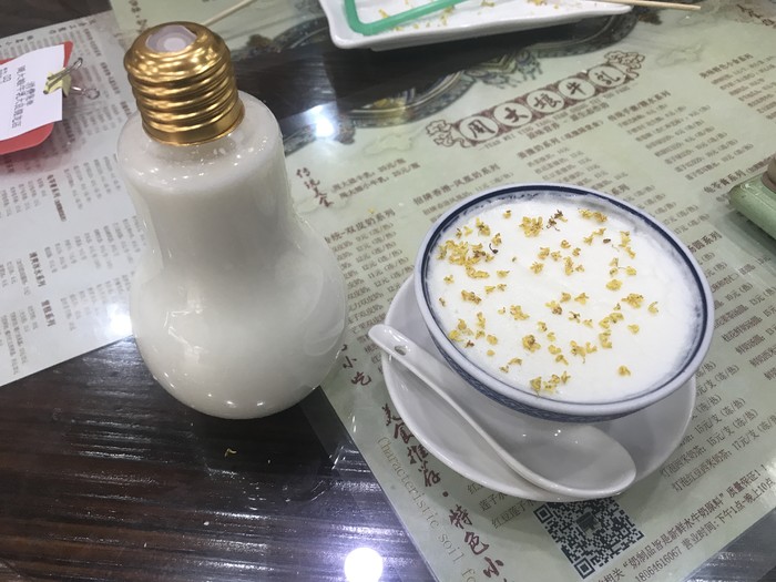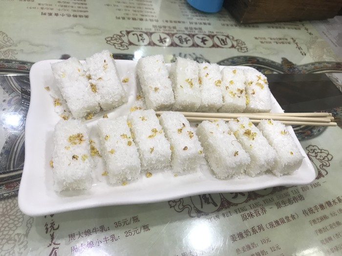 周大娘牛乳点了桂花双皮奶、牛奶砖、灯泡牛奶、钵仔糕:牛奶砖是店家推荐的,挺好吃的不算很甜,也适合做手信打包。桂花双皮奶不推荐!写到这里我真的不得不吐槽一下大良双皮奶,不知道是不是我没吃到金榜,大良的双皮奶都巨甜!砂糖不要钱似的,而且这家桂花还带点苦。灯泡牛奶也是,你不问他直接给你上甜奶,也是不要钱的甜,齁甜到我这个人都要卷缩了,甜到我都不想碰甜的。被前面甜味轮番轰炸到甜到吐后,最后伦教糕我也是只吃了一口就直接扔给奶总带回家。原味灯泡奶他们说就还行,不过还是银记第一,造型挺可爱的适合当手信,建议要原味!原味!原味!钵仔糕就普通街边做得不好的货色,不推。