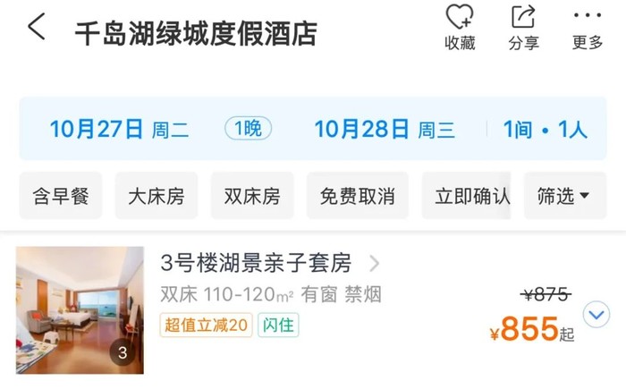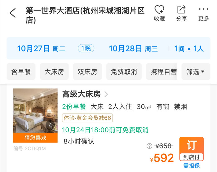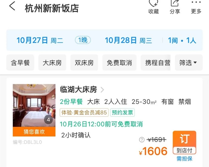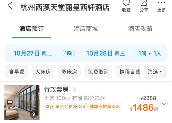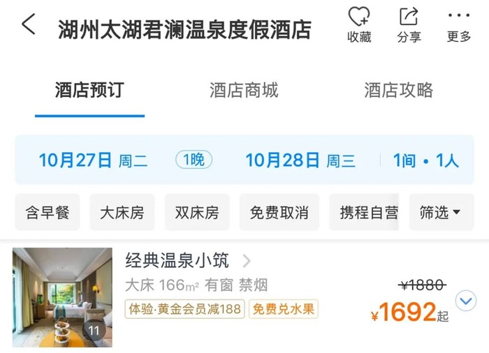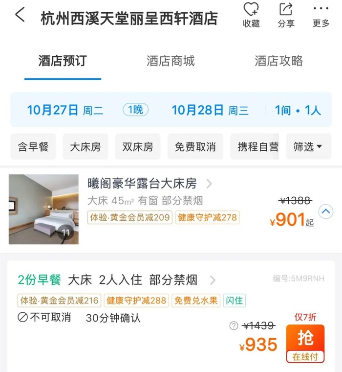 携程上平时同店同房型住1晚1710元(含早),现在购买套餐便宜712元。