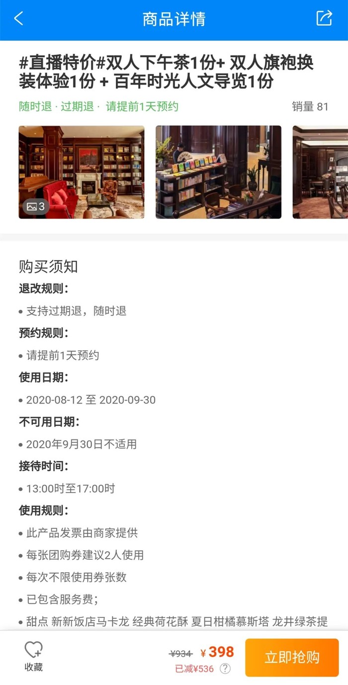 携程上平时同店同房型住2晚3212元(含早),现在购买套餐立省412元。而套餐中赠送的“双人下午茶1份+双人旗袍换装体验1次+双人百年时光人文导览”携程上售价近400元!划算了!