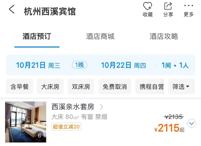 携程上平时同店同房型住1晚2115元(含早),现在购买套餐便宜一半不止,这价格真的很香了!而且暑期、周末通用不加价!