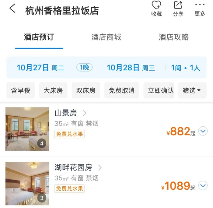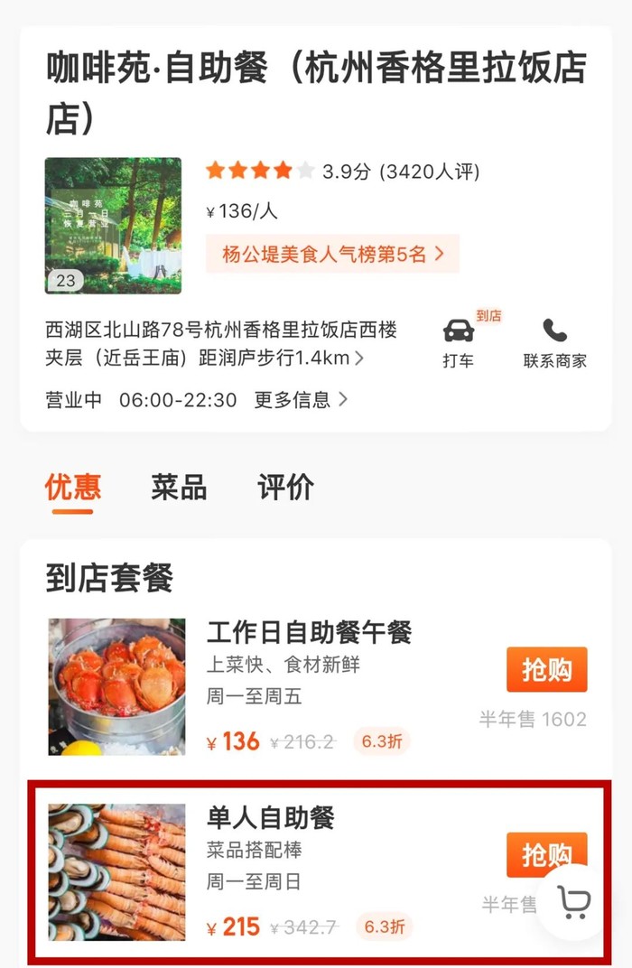 携程上平时同店山景房住1晚882元(不含早)、住1晚湖畔花园房1089元(不含早),这样一比,看起来酒店套餐处于劣势,但别忘了酒店套餐中还有2大1小自助午餐或晚餐(二选一),大家可以某团上搜一下,这家的自助团购价都是215元一个人呢。这么一算其实房间含早的价格也就500出头,位置优越、500元出头的香格里拉,香不香?