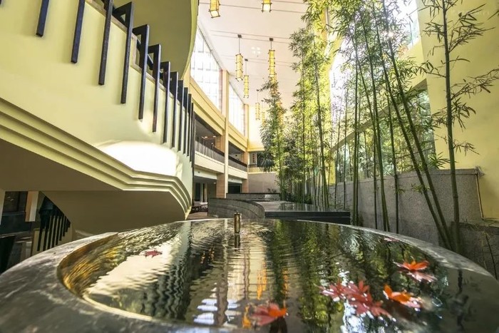 酒店楼房错落分布在林木花丛间,景观客房坐拥曲水萦绕,芦荻翩跹的视野。室内设计以简洁、幽雅、静谧融为一体,与西溪水景浑然天成。