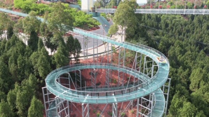 刺激绝对赶超依附地面的漂流,穿梭在竹林之间、溪流之上的高空,体验感可不是说说的,360°的双层环形盘旋,还有好几处S形弯道,过山车般盘旋、转弯、俯冲,全过程体验惊险与刺激。当你坐在气垫上,阳光将玻璃桥照射得通透明亮,穿梭在密林之间,耳旁吹过的凉风,别提多舒适自然啦!360度环形超长玻璃,光看图就已经按捺不住想放飞自己了。
