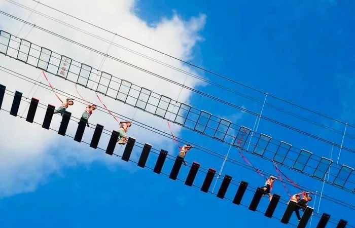全长200米的步步惊心网红桥,是全悬空踏板桥,两个山体之间用索道木桥连接,需要吊着保险绳走过去,是不是光看到图,心脏就已经在砰砰跳了!别害怕,景区游乐项目都是经过严格安全检查的,大家可以放心去体验高空带来的刺激感!