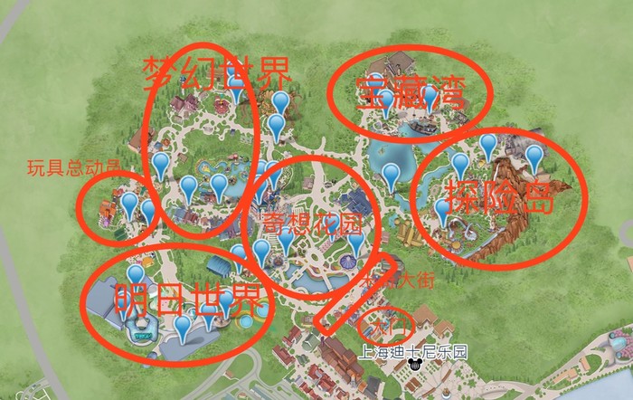 米奇大街、奇想花园、探险岛、宝藏湾、梦幻世界、迪士尼·皮克斯玩具总动员、明日世界.