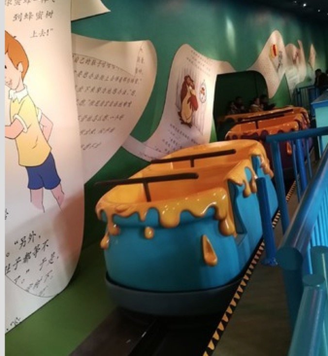 室内项目,屋顶有一个巨大的蜂窝,还有许许多多的蜜蜂。下面有18个巨大的足以承载一家人的巨大蜜罐,就是乱转.