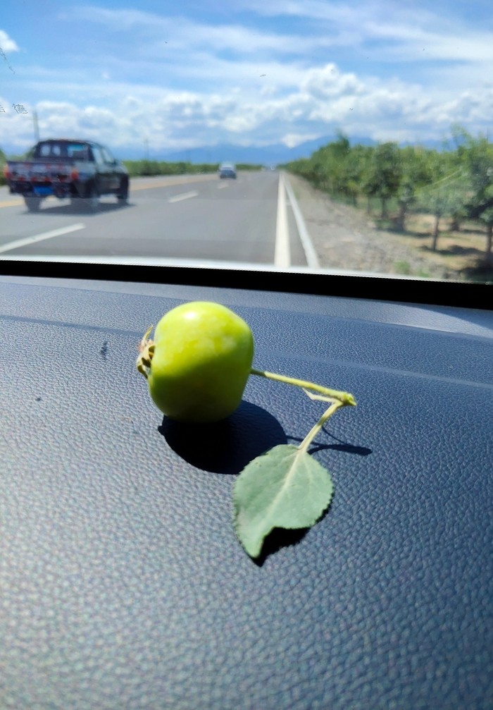 过了收费站以后,在路边停下来,他们抽烟喝水,我下车摘个个小苹果。