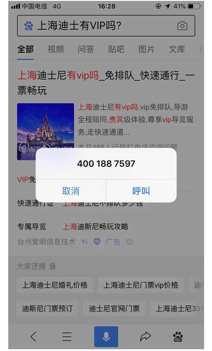 宋先生向记者讲述了事情的来龙去脉。7月13日周六下午,宋先生闲来无事,在手机上搜索上海迪士尼的游玩信息,为即将成行的旅游做准备。见普遍反映暑期排队厉害,有游客建议购买官方的VIP服务,他便打开百度,输入“上海迪士尼有VIP吗”试图了解具体信息。百度反馈的首个搜索结果,便打着“尊享VIP、免排队、快速通行、一票畅玩”的标题,下方的页面信息,还写有“导游全程陪同、走快速通道”等信息,让宋先生一下子来了兴趣。