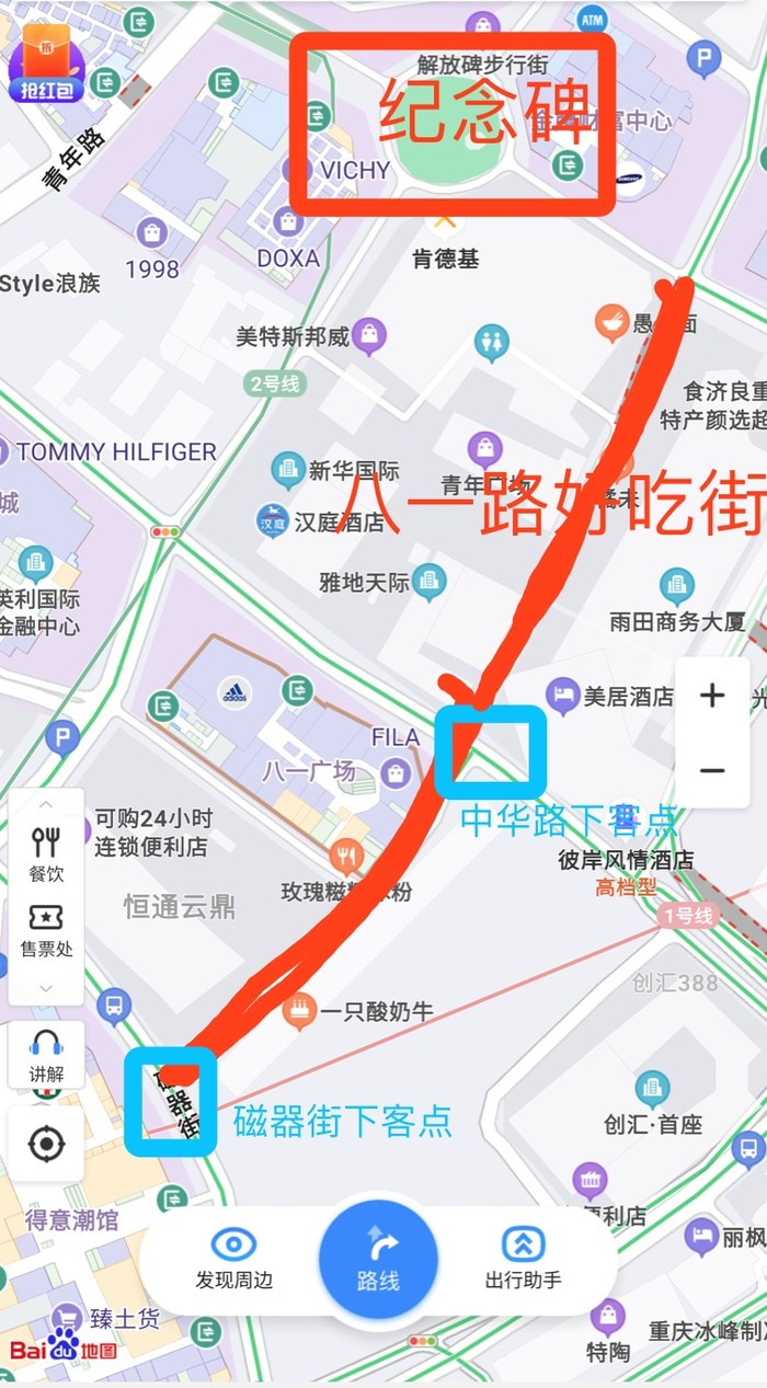 2、非早、晚高峰,打车到解放碑,通常下车位置: 磁器街(八一路好吃街起点)、中华路与八一路交点,下图.