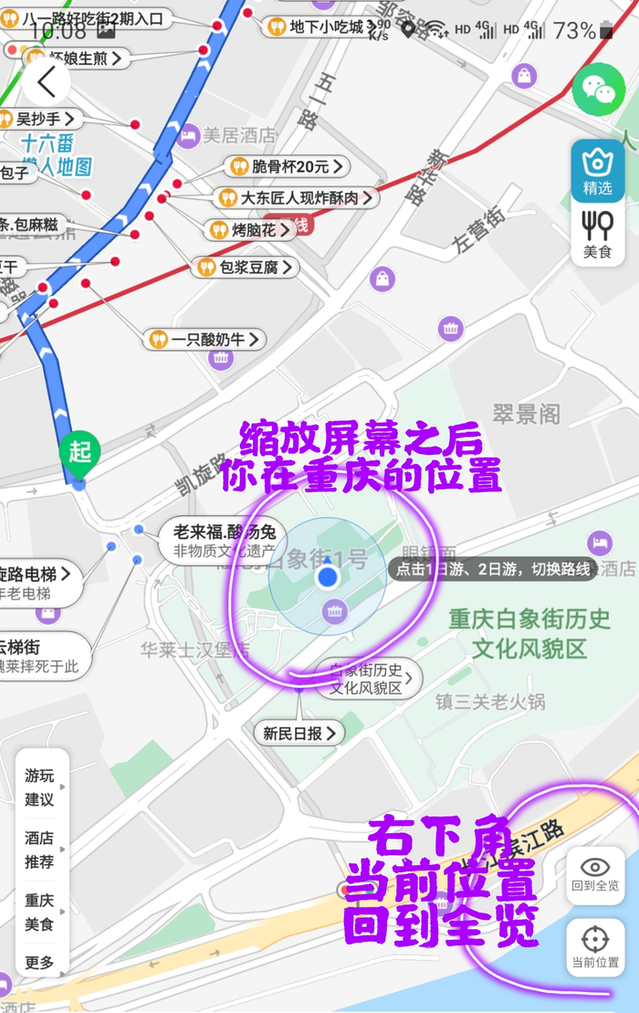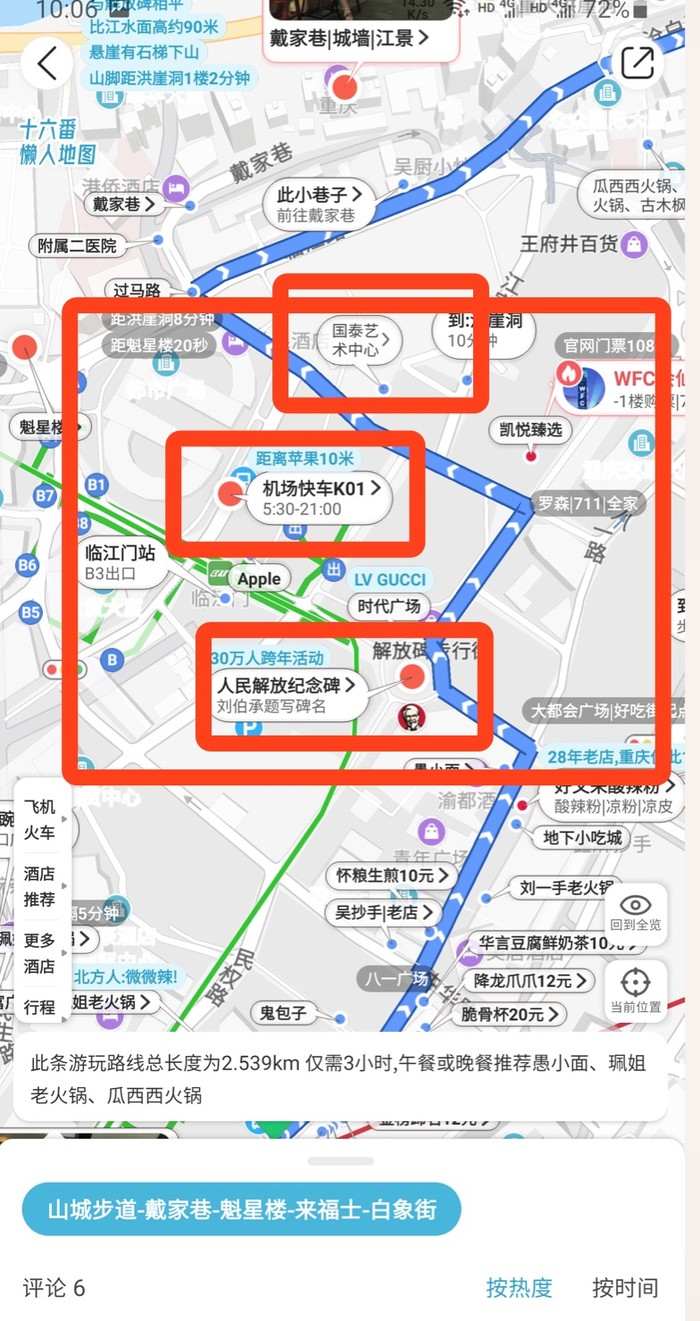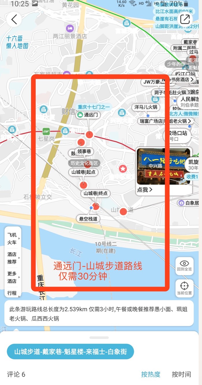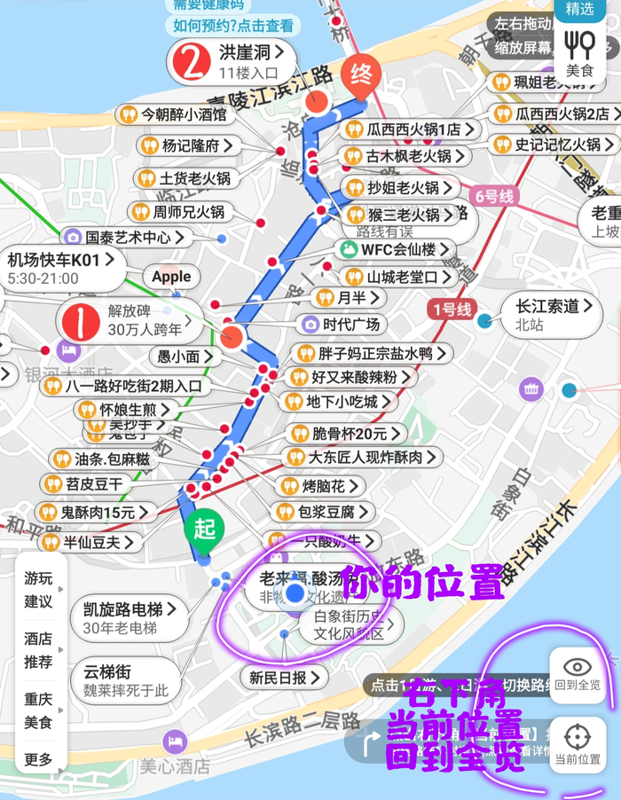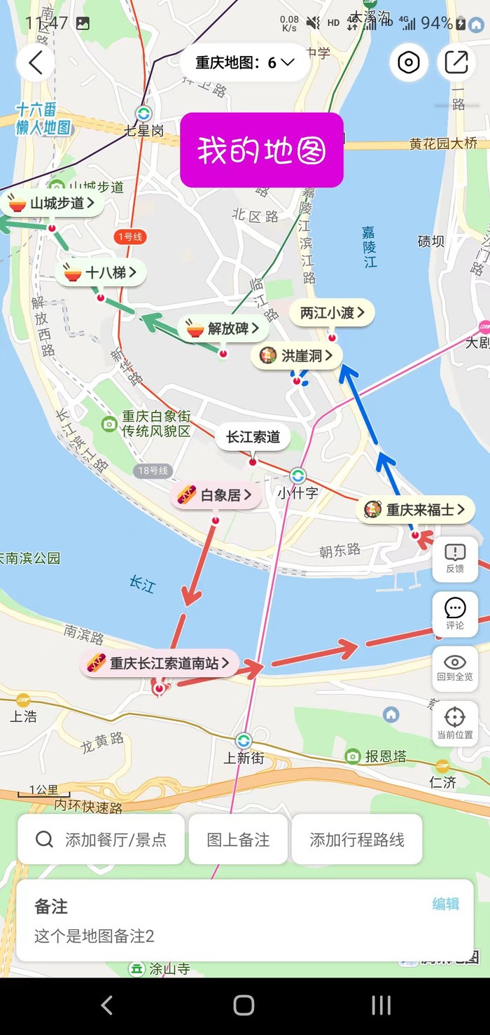 第4步:在有路线的懒人地图上面(比如“重庆行程地图-半日游”路线,“六条路线地图-路线3”等等),跟随十六番官方规划路线行走,不走回头路。