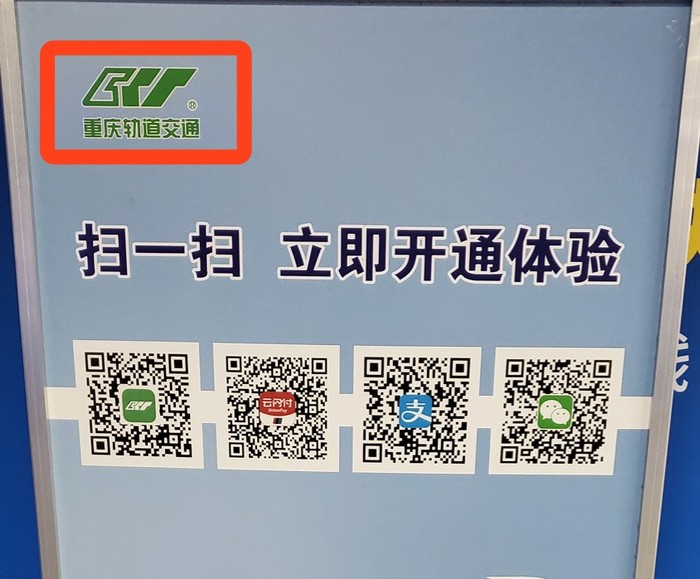 重庆轨道交通支持“渝畅行”、“云闪付”、“支付宝”、“微信”4种App扫码进站,并且每一个地铁站,都有牌子(下图),只需要选一个二维码,扫一扫,再顺着引导,就行了!