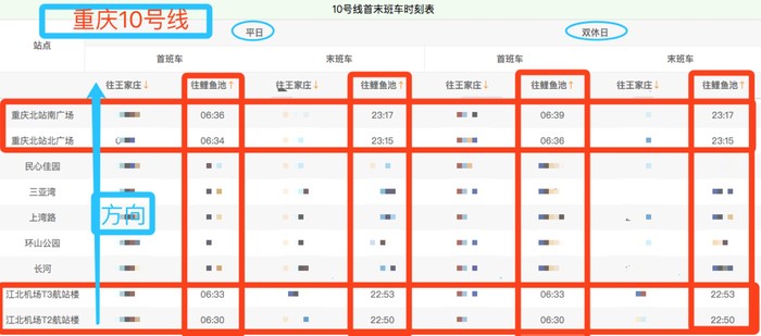 (下面截图来自:重庆官方 "轨道交通时刻表",点击上2行链接查看全部)