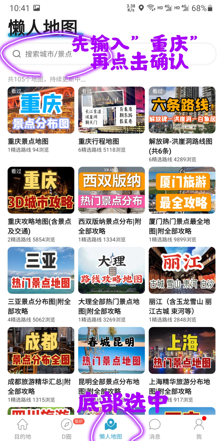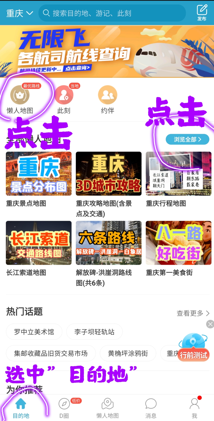 方案二,目的地选择“重庆”,然后点击“懒人地图”或者“浏览全部”