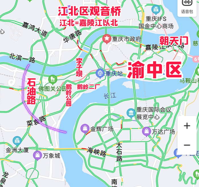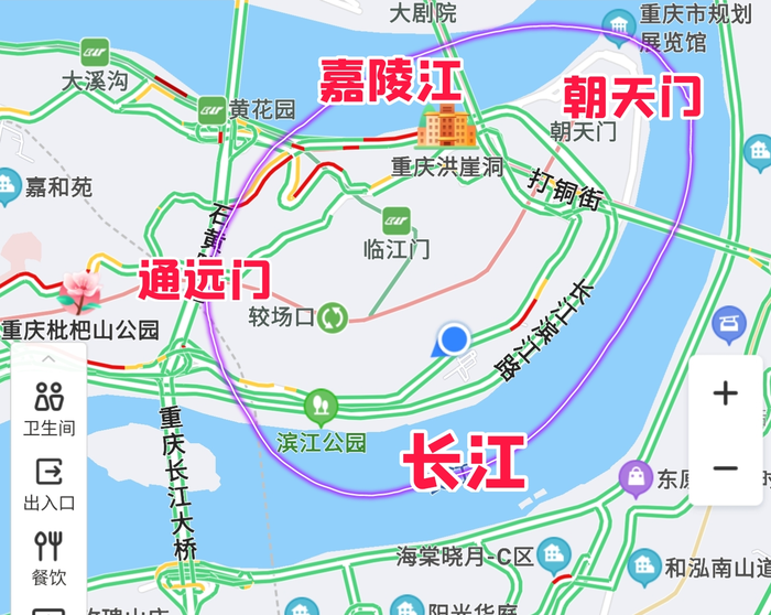 渝中区,指的是“两江以内,大概石油路旁边到朝天门码头”的区域(是大概,并不精确,下图),它整体就是一匹山,西高东低,越靠近江水,地形越矮,整个城区都在不停的上下坡,所以重庆又叫山城。补充一点,鹅岭公园是渝中区海拔最高区域,公园里面的瞰胜楼,适合登高望远,看日落、夜景,“李子坝-鹅岭二厂路线图”有标注瞰胜楼位置。