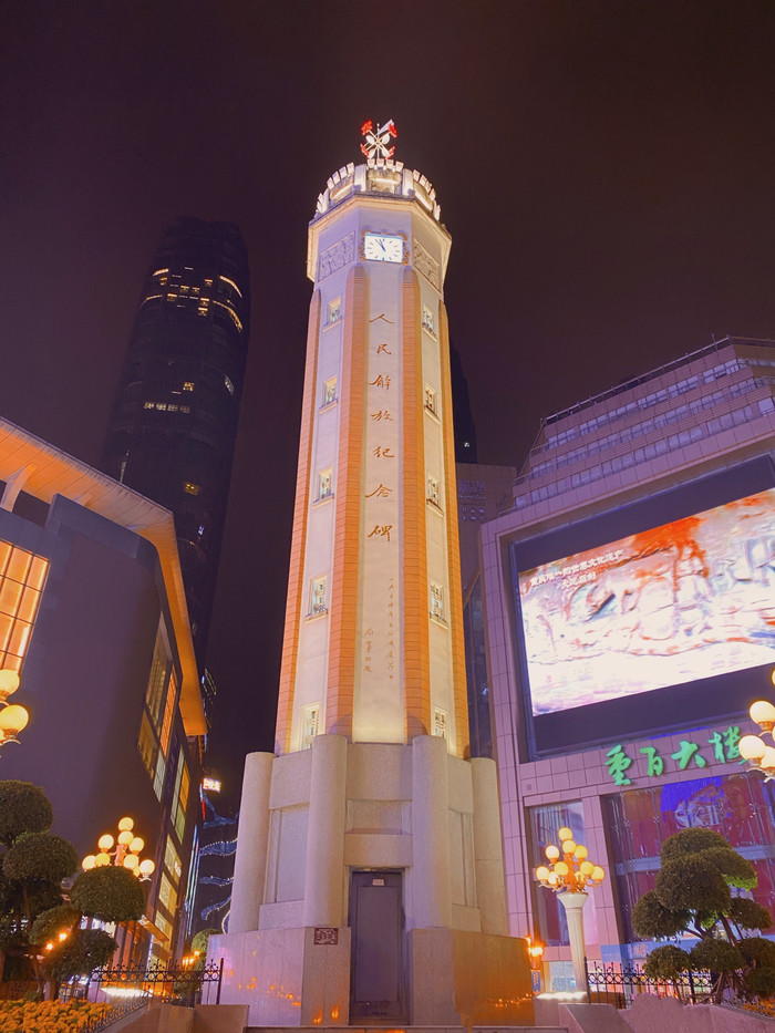 本地人一般指“解放碑步行街”,比如“周末去解放碑逛逛”,指的是步行街及周边。在步行街中心位置,就是“人民解放纪念碑”碑体,对于游客来说“解放碑=纪念碑”,下图。