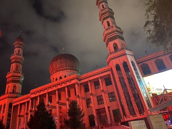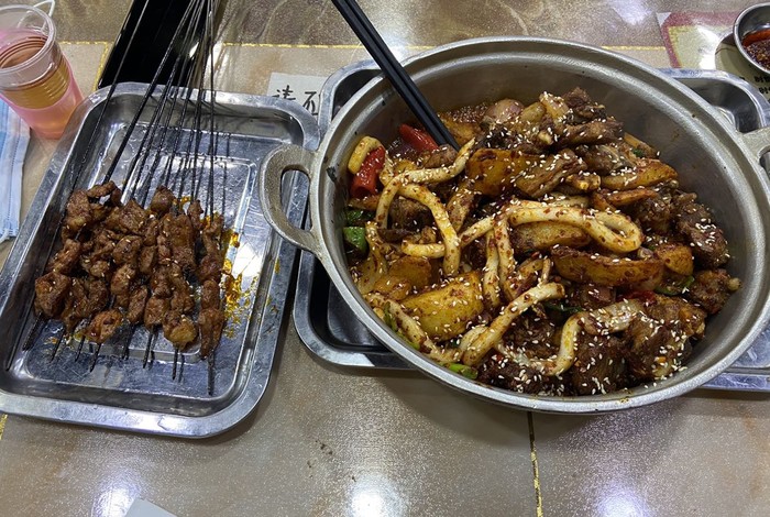 右边的炕锅羊肉好吃,有点像我们烧烤的味,孜然味重,大粉条好吃,就是量太大了。吃完散步回酒店,这时候已经感觉到有点凉意了。途中还遇到了东关清真寺