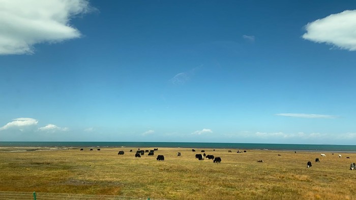 D1:7.30和司机定好的出发时间,起床发现下着蒙蒙细雨,心里还有点纳闷,4个人浩浩荡荡的拖着行李箱出发了。西宁到青海湖大概3个小时左右(此次行程每天都要早起,所以新get到一个技能,在车上化全妆!)慢慢悠悠化好妆已经可以看见车外开阔的草地,牛羊成群,天空白云一簇簇,是南方很少能看见的。此时此刻的我们已经兴奋起来,拍个不停