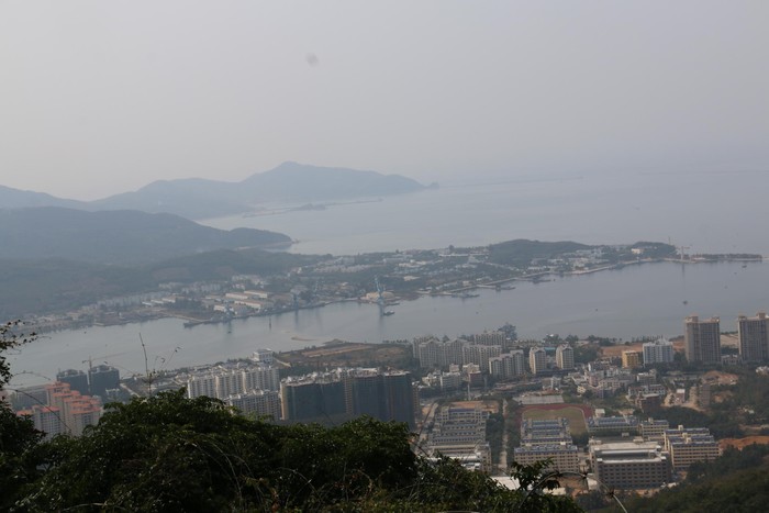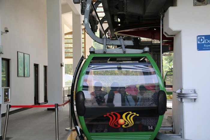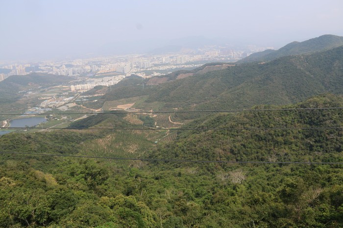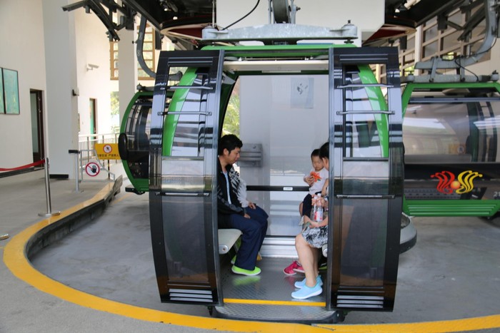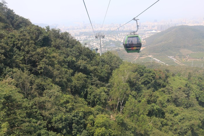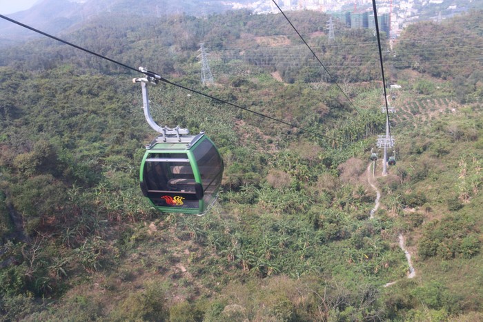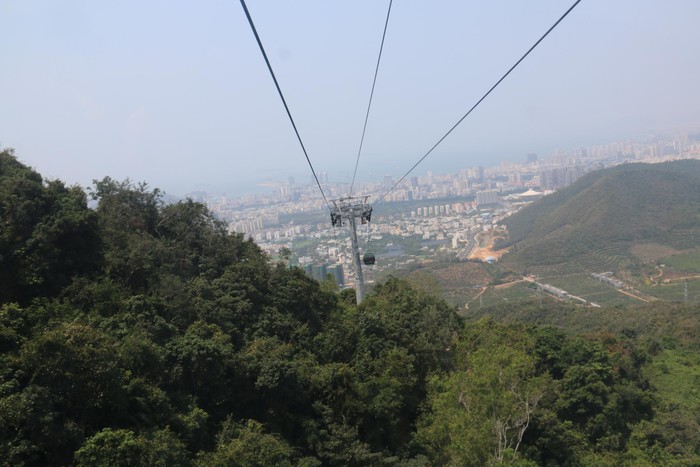 每个缆车车厢可容纳八人,单程运行时间约10分钟。既是通往山顶公园的交通工具,更是一种动态观景方式,稍微恐高的我真心感觉到舒适,因为慢,所以一点不紧张,缆车由最低点慢慢上升,竟然能看见脚下的一大片芒果树上吊着的芒果,整个三亚的全貌也慢慢呈现眼底