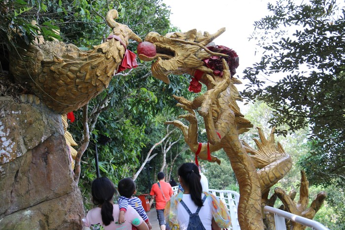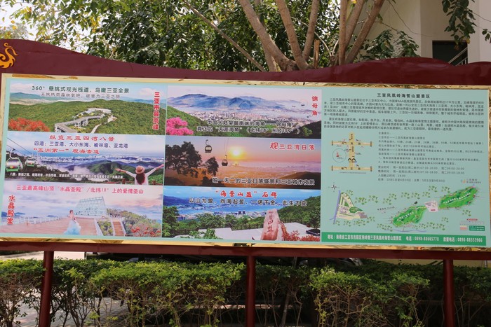 景区售票处有简单的路线,景点介绍,期待着上山后能看三亚的四湾八景!游览路线为,景区大门-接待中心-风水龙景观-空中索道缆车-服务中心-九曲桥-来仪台-舞凤台-忘鹿台-百鸟朝凤雕塑-朱雀台-九曲桥-海誓山盟广场-鹿心亭-如影阁-爱情花廊-水晶圣殿-长相厮守台-世界四大宗教的爱情文化-缆车返回