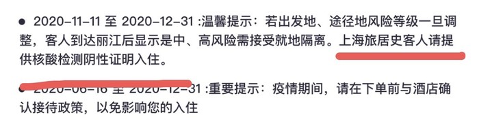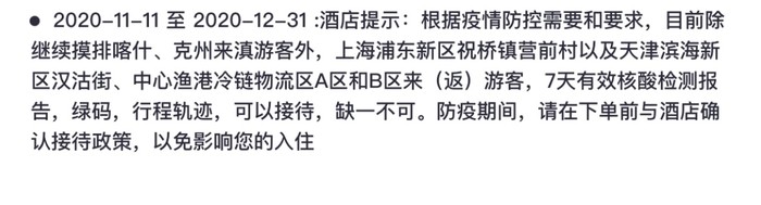 一部分酒店要求来自上海、喀什、天津游客,提供 7 天有效核酸检测报告。(例如丽江金茂璞修雪山酒店)