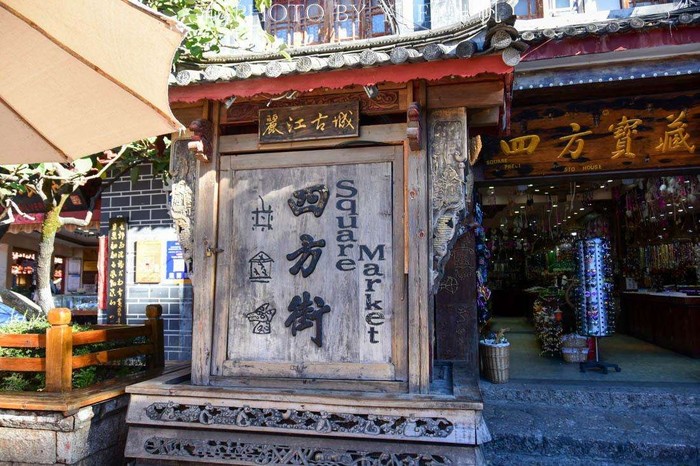 四方街是古城的中心广场。广场的形状很像方形的知府大印,由土司取名四方街,取“权镇四方”之意。也有人说是因为这里的道路通向四面八方,是四面八方的人流、物流集散地,所以叫四方街。