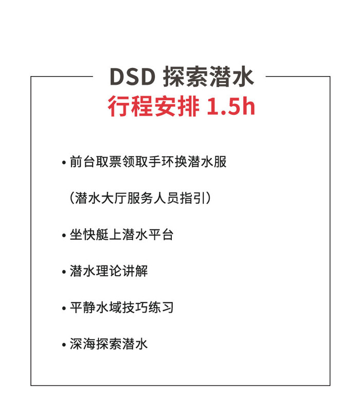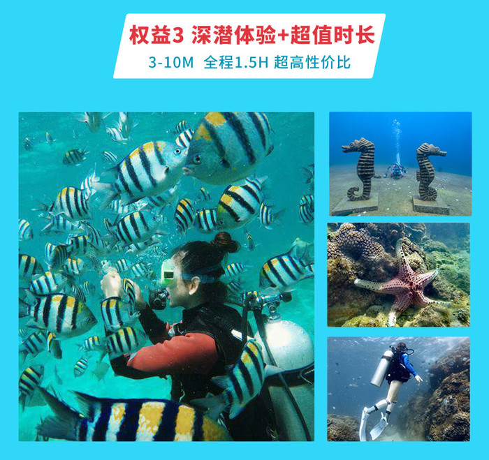 1、游玩深度:3-10米;体验时间:45分钟;休闲体验类潜水。