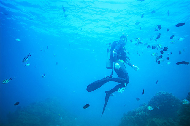 2、潜点为自然景观保护较为完整的珊瑚礁潜水点。在专业教练一对一陪同领下,观赏形态迥异的各类珊瑚群及色彩缤纷的热带鱼群,探索神秘的海底世界