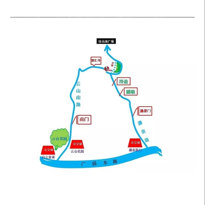 游玩白云山,最好从南门上山,离市区近,还有索道、观光车,并且只有南门才有索道。娱乐项目也比较近(比如滑草、滑道、蹦极)。特别提一下,飞索不在南门,位于魔星岭下边。