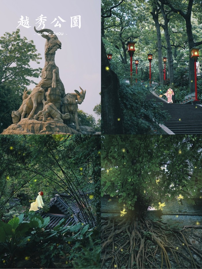 越秀山公园,即越秀山,国家4A级旅游景区,广州的风水宝地。景点包括:明代古城墙、镇海楼、五羊石雕、绍武君臣冢、中山纪念碑、广州美术馆、伍廷芳墓。