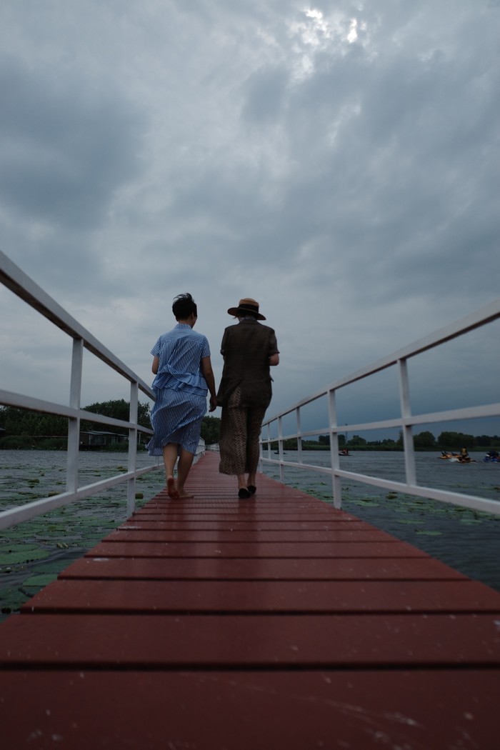 穿过芦苇丛就是那个长桥的尽头,好美呀!下雨了,我们边走边拍。由于我的手机没电了所以,雨中的池塘,荷叶上的雨滴珍珠一样泛着光滚动着,以为是烟雨朦胧的江南。。。。。