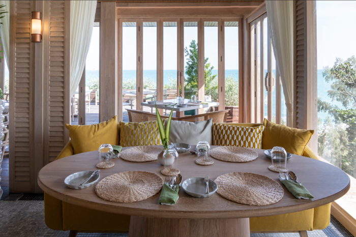 “ Long Dtai”餐厅坐落在私人岛屿的最高点,绝佳的位置,无论坐在餐厅的任何角落都可以将无边大海尽收眼中,餐厅是米其林星级厨师大卫•汤普森(David Thompson)携手凯璞法恩酒店共同打造的,餐厅整体具有南洋风格的原木建筑,四周以透明玻璃围绕,内部淡绿色和棉麻色的布艺,在暖黄色的灯光下显的无比柔和,在海岸月夜之中像是一艘缓缓航行的轮船,又像是一颗正在吐露着海水的明珠。