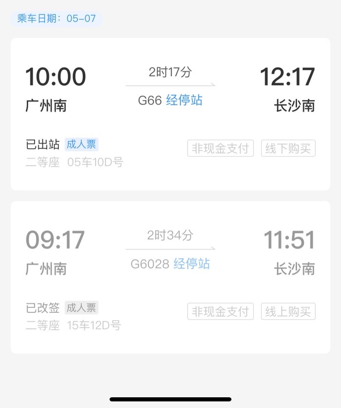 ①  高鐵票(廣州南往返長沙南) 合計¥1256