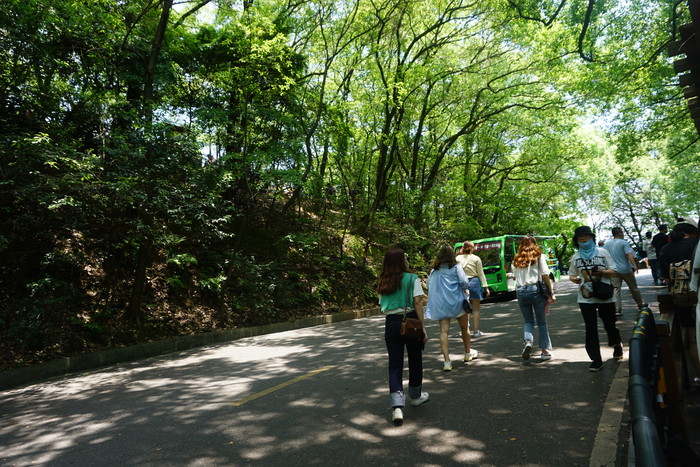 我們本來規劃東門坐纜車上,南門路線步行下山。想買纜車票的時候聽到別人說要排隊一個半小時,我們就選擇買觀光車的票上山了。