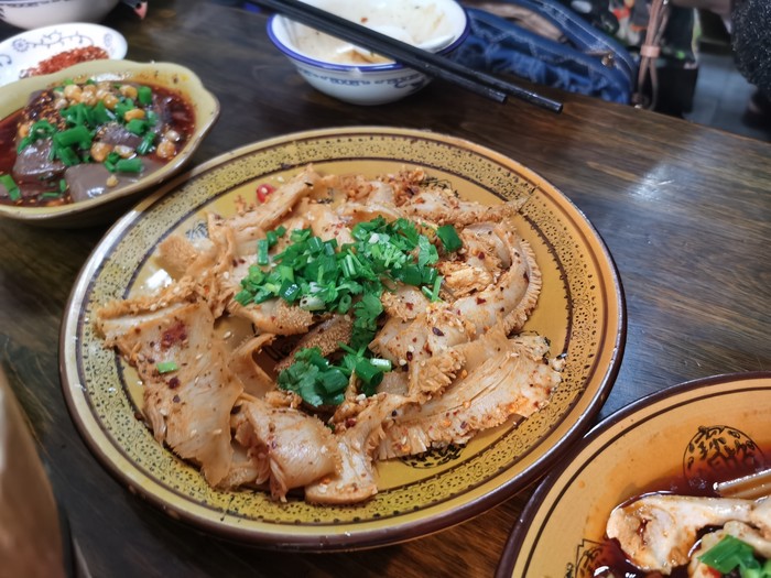 跟着一位资深吃货一路介绍和引领走进了游记肥肠,我们点了糯米肠卷,香卤肠头,豌豆肥肠汤等等。钟爱肥肠的同学可以来尝尝。