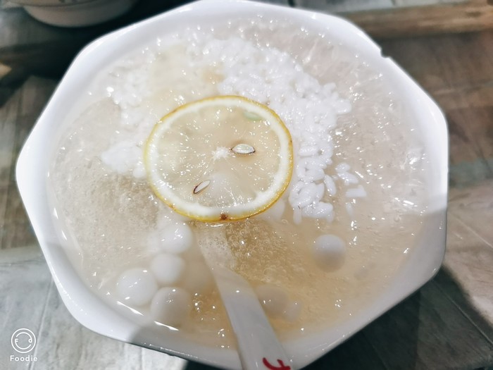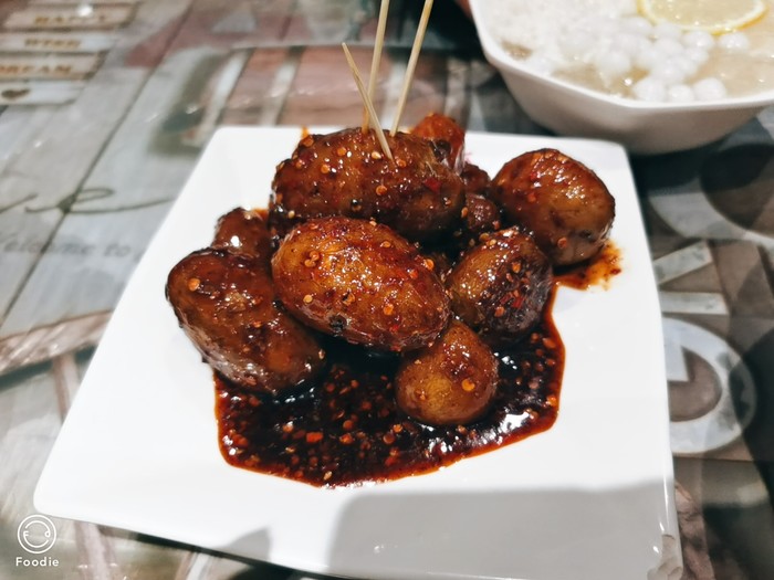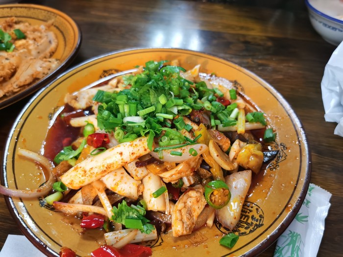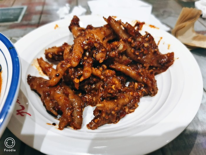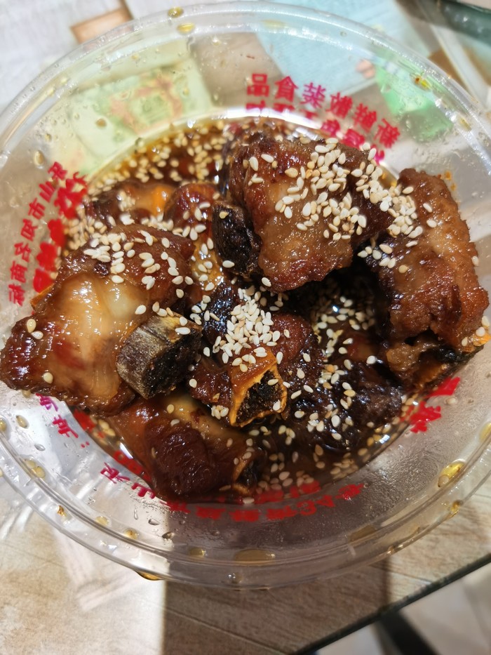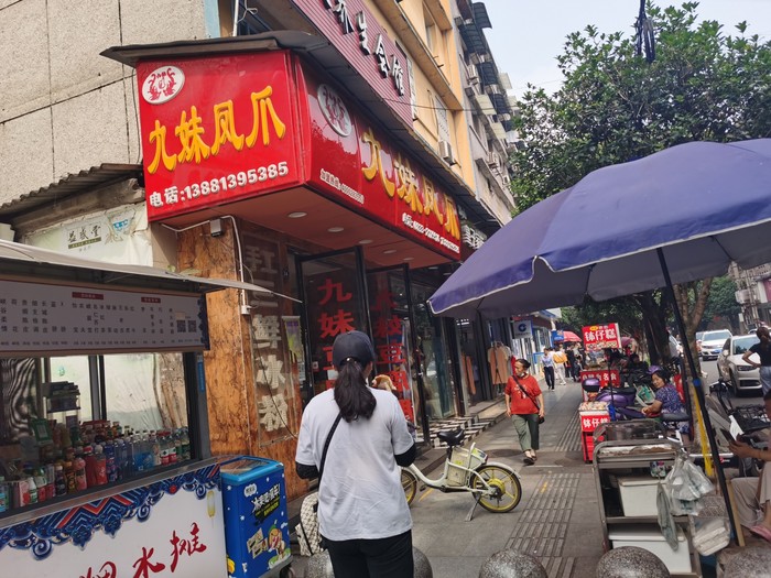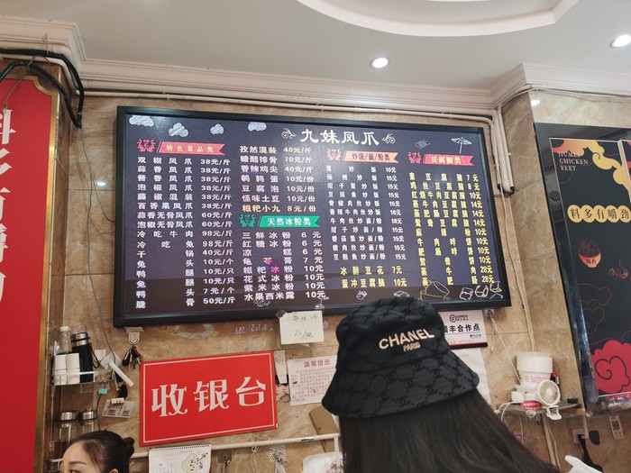拿着蛋烘糕进入旁边这家九妹凤爪。凤爪味道有很多种,酱香,蒜香,百香果,双椒,藤椒等等,有有骨和无骨的。小土豆也有几种味道。特别推荐三鲜冰粉和豆腐脑(素豆腐脑就挺不错的)及怪味土豆。糖醋排骨颜色红亮,味道偏荔枝味。素豆腐脑说是素的,里面还有馓子、类似酸辣粉里的粉条和少许芹菜粒,有点特别。三鲜冰粉必须得说说,冰粉里面加上一片柠檬,一勺醪糟,一勺小汤圆,一朵小银耳,一点柠檬汁,再加上舀冰粉阿姨的花式高抛手法让三鲜冰粉荣登此次旅程的最佳推荐,简直完美。让我这个不太喜欢吃醪糟的人都赞叹不已。