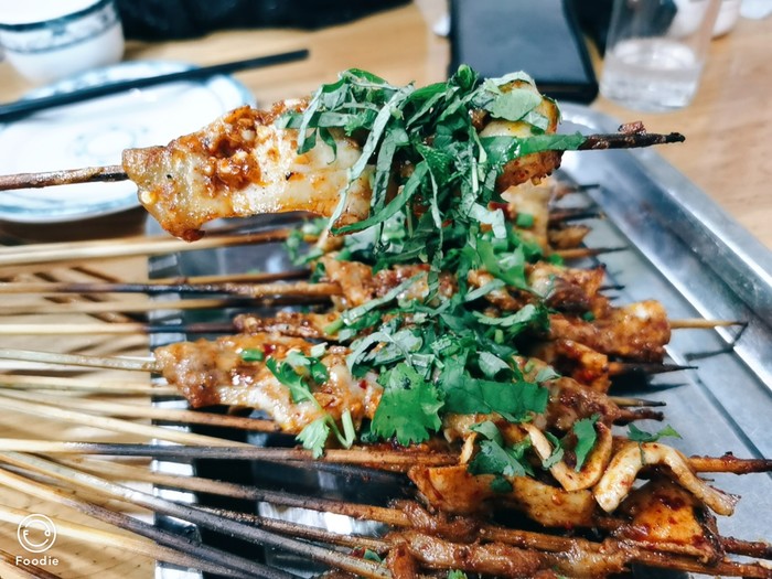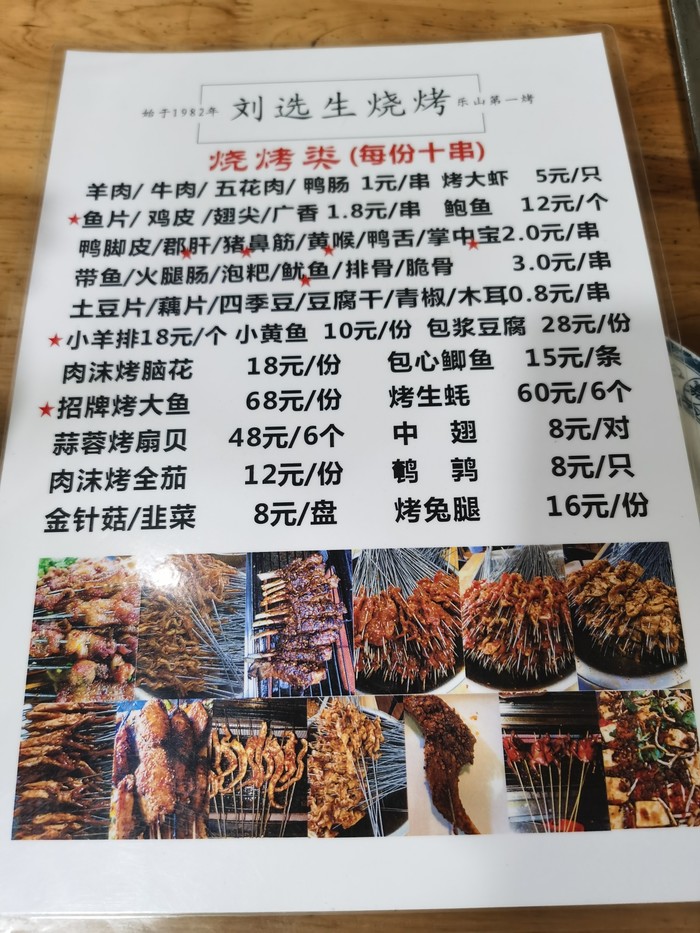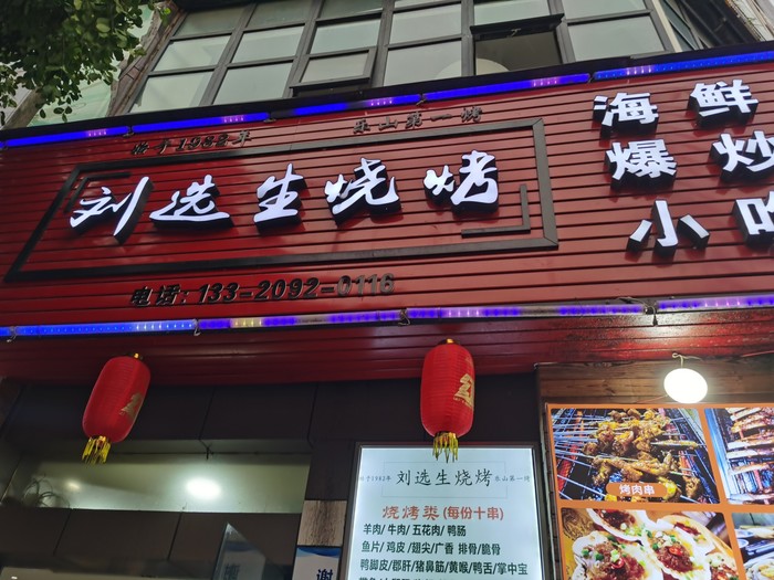 为了更好的品尝下一道美食,我们决定沿着江边步行过去。伴着凉爽的江风,既欣赏了乐山的美景,又为下一顿美食腾空了胃。走了1个半小时后,来到了朋友心心念念的刘选生烧烤。特色的烤鱼片和滑糯的烤猪鼻筋,酥脆的烤五花肉,土豆片安逸。