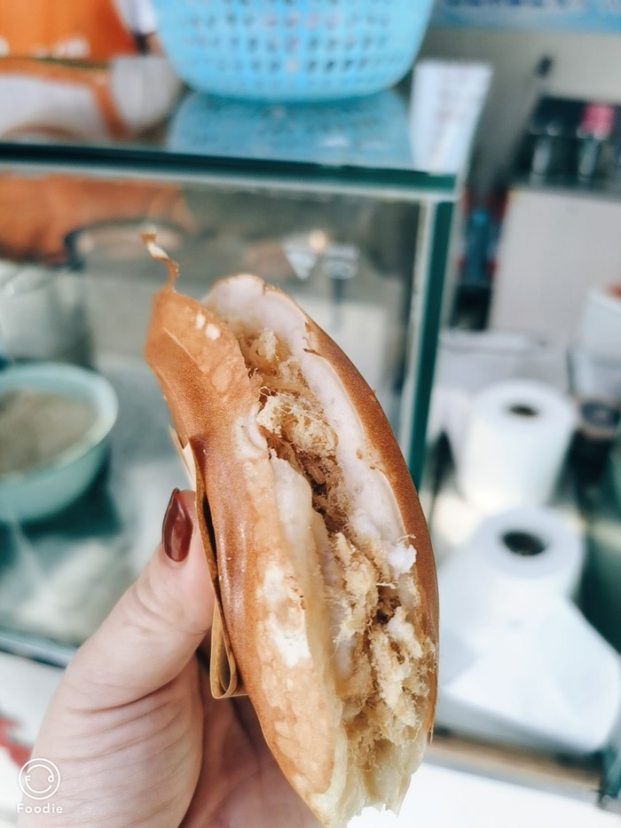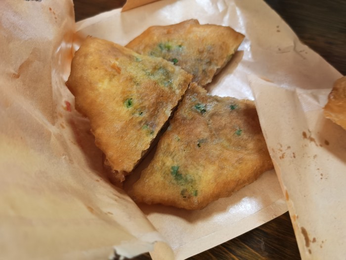 第一站直奔九妹凤爪。沿着滨江路步行不到10分钟就进入美食街。很多有名的都在这一路。先来个沃尔玛旁边高师傅的蛋烘糕,点了奶油加肉松和奶油加果酱,中规中矩。朋友对食物的要求很高,建议说下次如果看到在高师傅有两路队伍排队的话,一定要排老高师傅这边,火候更到位。