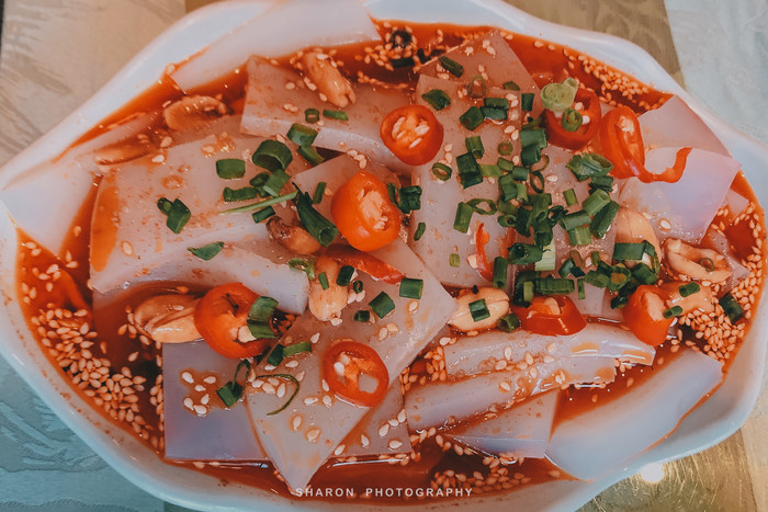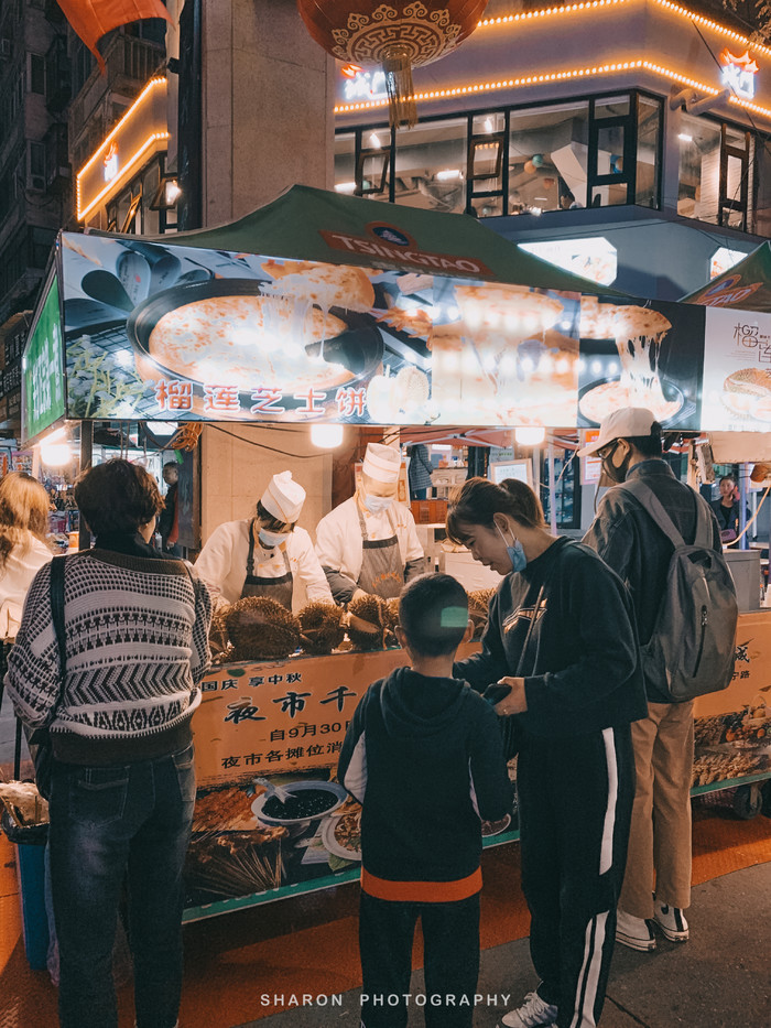 热闹的正宁路简直不要太让人流口水,一眼望不到头的街道两侧摆满了各式各样的小吃美食,入口就一家香味四溢的榴莲芝士饼,再往前就是卖羊杂汤和鸡蛋醪糟的各个摊点,人潮涌动,香味四溢。