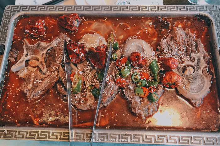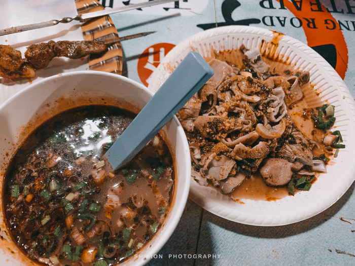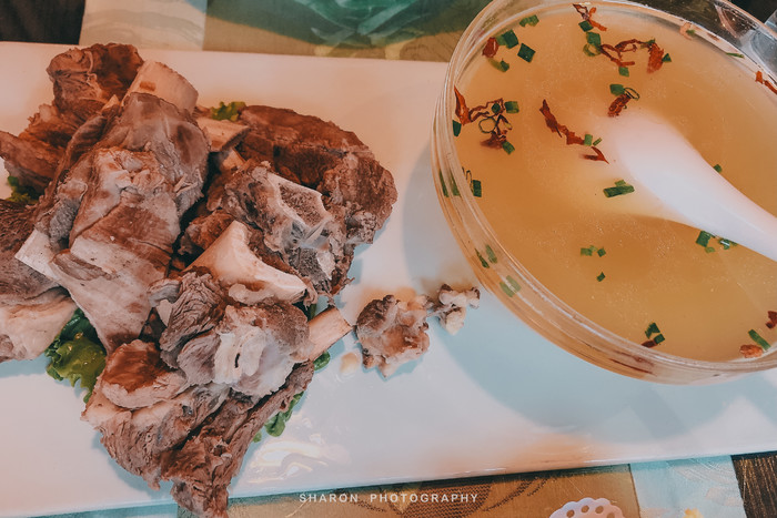 西宁的美食街简直不要太多,但网红夜市不过如此,可惜碰到整修没能逛到推荐的水井巷小吃街,最后约了另外两个小伙伴在莫家街夜市集合,这里太早是没有出来摆摊的。晚上选了一家古色古香的西北清真馆[雅君羊羔肉],美美的吃上手抓羊肉,秘制牛脊骨,还有狗浇尿。至于餐厅的八宝盖碗茶虽说不错,但这糖块未免也太大了,泡10碗都嫌甜,取出来以后味道好多了。