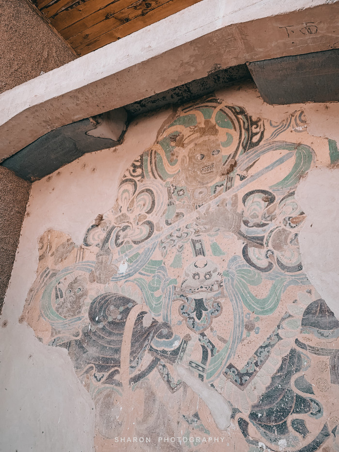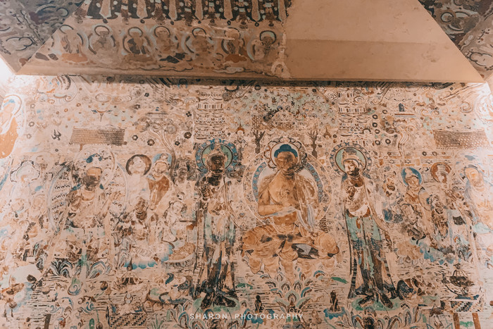 我们参观了23-24号洞窟、340号洞窟、296号洞窟,以及含有唐代雕塑原件的328号洞窟、出土五万余建文物的16-17号洞窟,西魏时期的249号洞窟,还有最令人记忆犹新的259禅定佛微笑壁画的洞窟。最后A类和B类都在一个地方一同排队,进入96窟的大佛殿观看唐朝修建的35米高的弥勒菩萨。据说武则天统治时期对民间声称是弥勒菩萨化身,借助宗教感召力化解传统观念的阻力,受时代背景的影响,建造的弥勒菩萨丰盈圆润,甚至有些许女性着装特征。为了保护文物,洞窟内禁止拍照,一切都留在记忆里吧